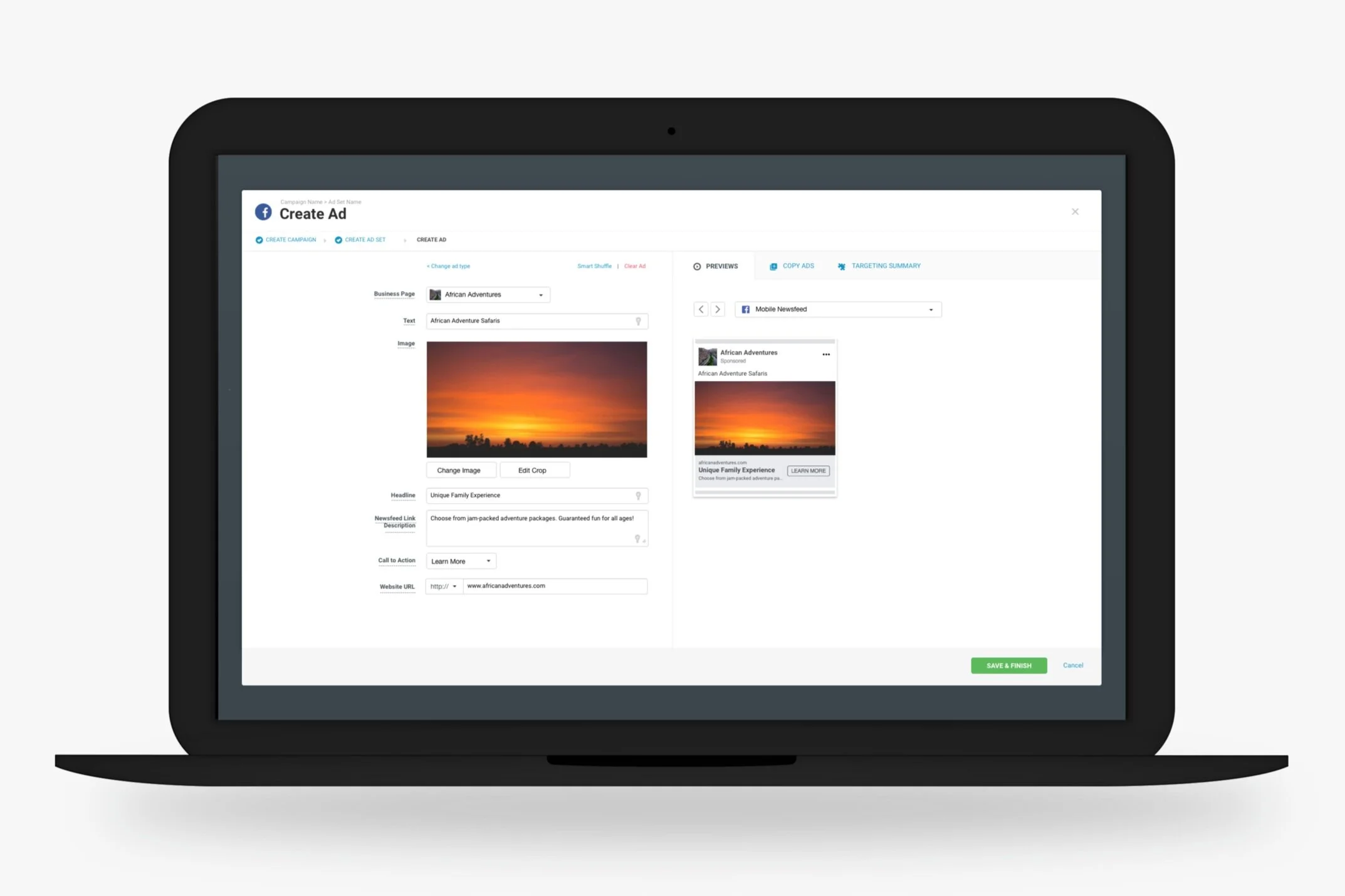 One of the biggest annoyances of our old ad creation flow was the two steps required to create, then preview your ad. On the first step, users could write ad copy, choose an image or video, and quickly duplicate the ad to make a variation before continuing to the review step. The review step displayed ad previews as returned through Facebook’s API. We found that users were frequently jumping back and forth between the creation and review steps to make adjustments to their ad after seeing what it looked like.